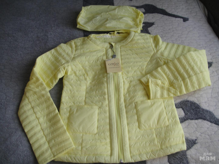 Красивый цвет - лимон,идет в размер 152-158,есть легкий капюшон.Новая, не на пухлика. На весну-осень. Легкая.