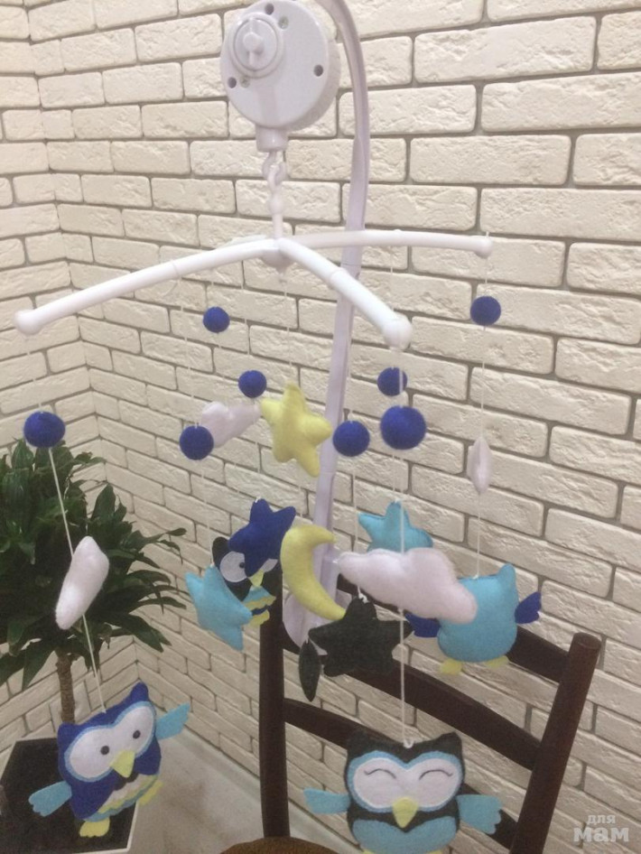 мобиль в детскую кроватку ручной работы.В комплект входит: Игрушки из гипоаллергенного фетра, кронштейн для крепления к кроватке, крестовина на которую подвешиваются игрушки, музыкальный блок. Мобиль будет радовать и развивать вашего малыша, а так же может стать отличным подарком на рождение крохи.
