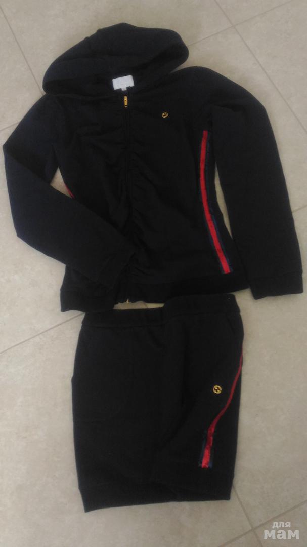 Костюм темно-синего цвета,плотный трикотаж,низ юбка с трикотажным поясом,хорошо на худенькую девочку.