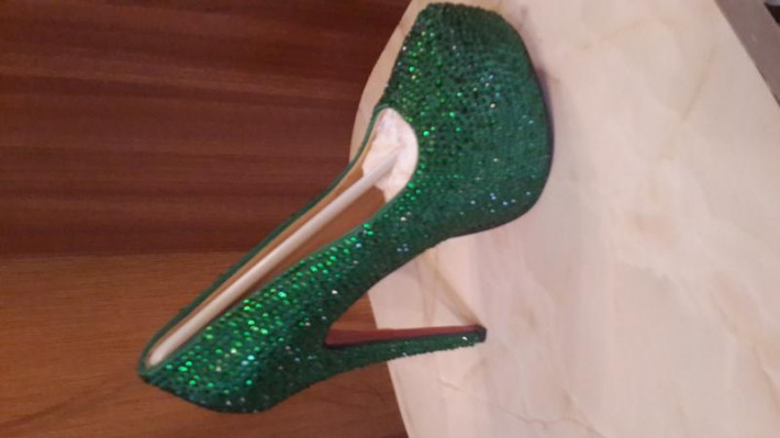 Продаю НОВЫЕ зеленые туфли. Цвет как на фото. Очень красивые и удобные (мне не подошла высота каблука). Высота каблука 14см, скрытая платформа. Размер 35-36. Отделаны стразами. В жизни они очень красивые, не пожалеете.