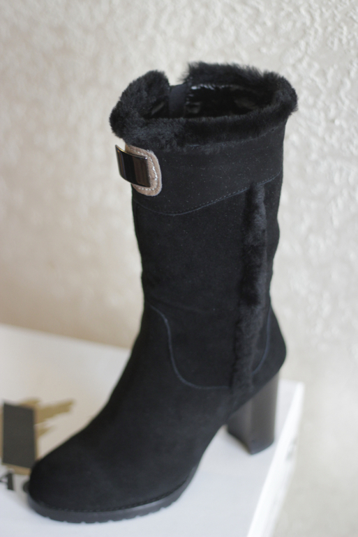 Элегантные женские зимние сапоги на устойчивом каблуке. Верх модели выполнен из нежной черной замши и дополнен меховой окантовкой и кожаной металлической вставкой. Внутренняя отделка выполнена из меха.