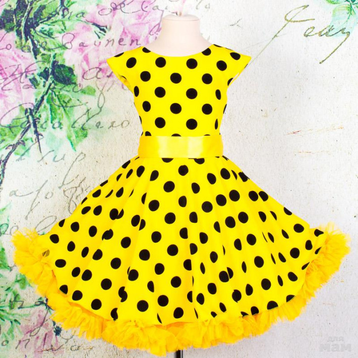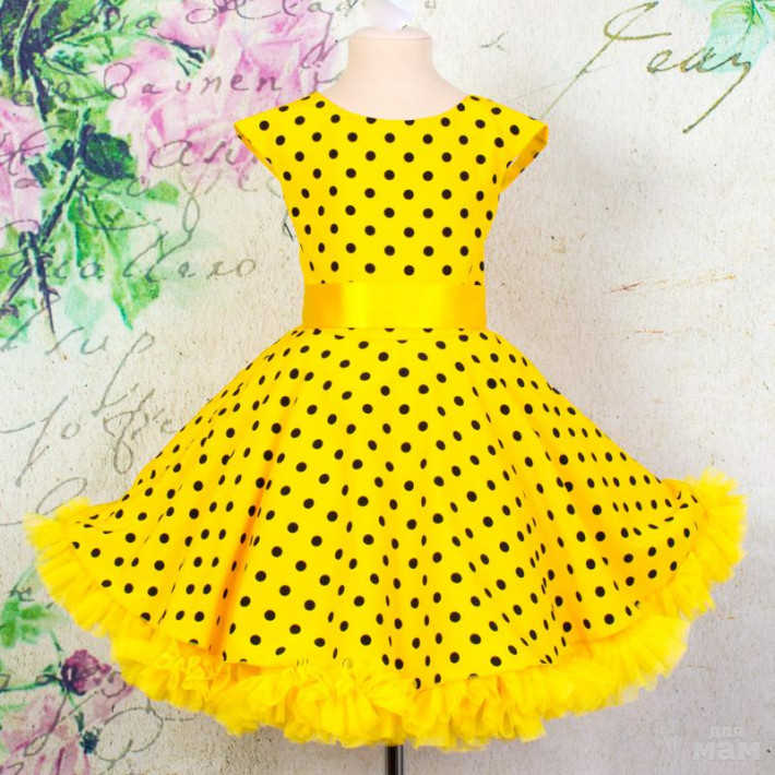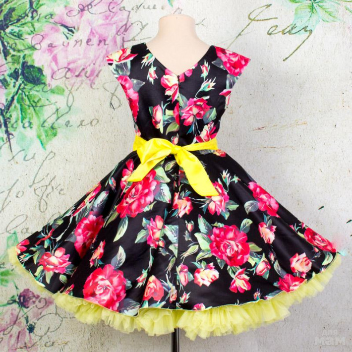 Под верхней юбкой - оборки и рюши из лимонного фатина, благодаря которым платье смотрится пышным.