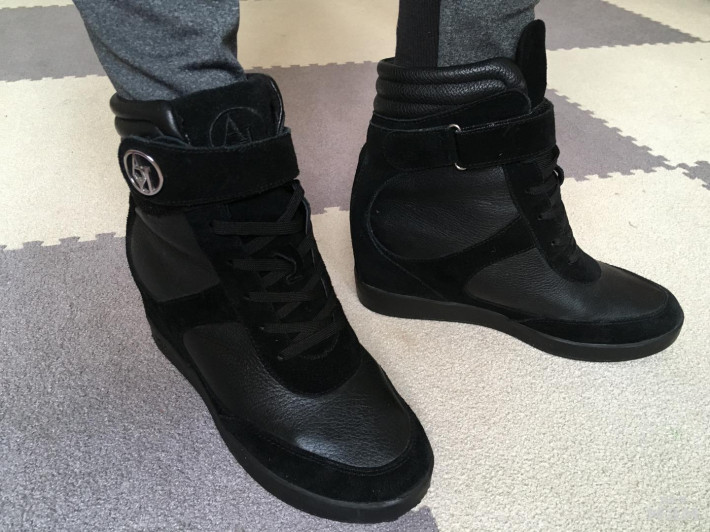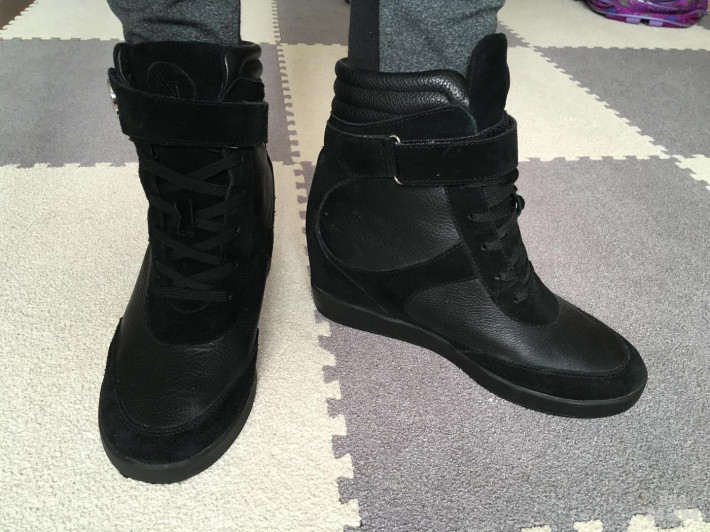 Кожа+замша. Шнуровка, липучки. Внутренняя танкетка (нога как бы на каблуке). На среднюю ногу, все регулируется если нужно.