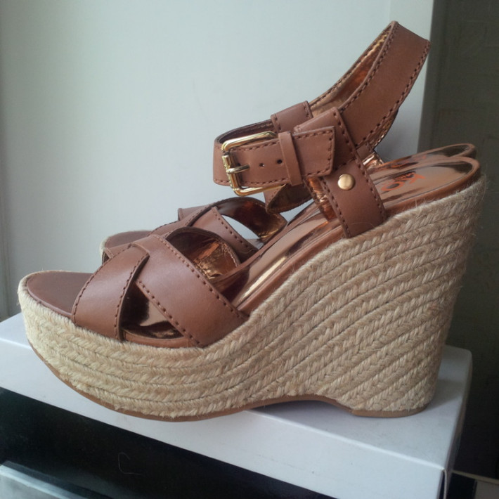 Оригинал,вторая линия, натуральная кожа, цвет светло-коричневый, танкетка 14см, платформа 4см! Очень удобные. Пойдут на стопу 26,5см. Розничная цена 385$