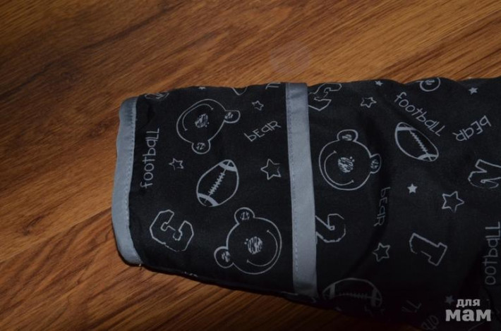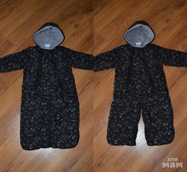 Можно использовать как конверт или комбинезон, рукав с отворотом-варежкой. Верх - непромокаемый, ветрозащитный слой, утеплитель синт. материал+флис.