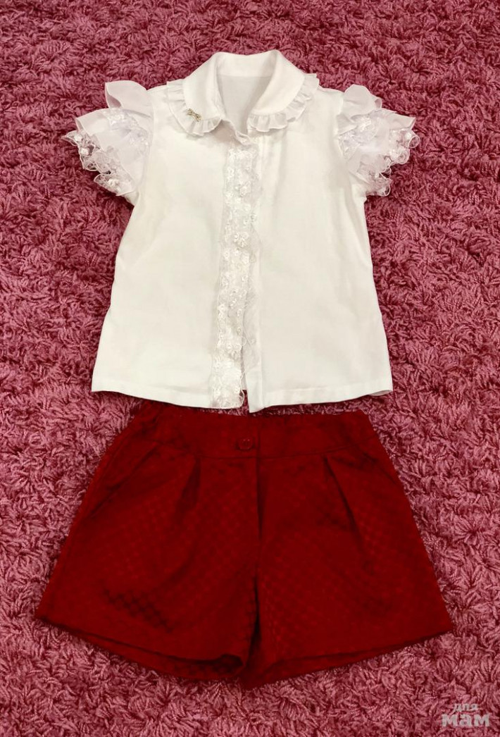 Очень красивые и стильные шорты Куки ( носим такие синие) эти новые с отрезанной биркой и нарядная блуза Дювали трикотаж с шикарными рюшами на рукавах и оригинальной отделкой ( надета один раз и постирана) . Комплектом за 1000 р