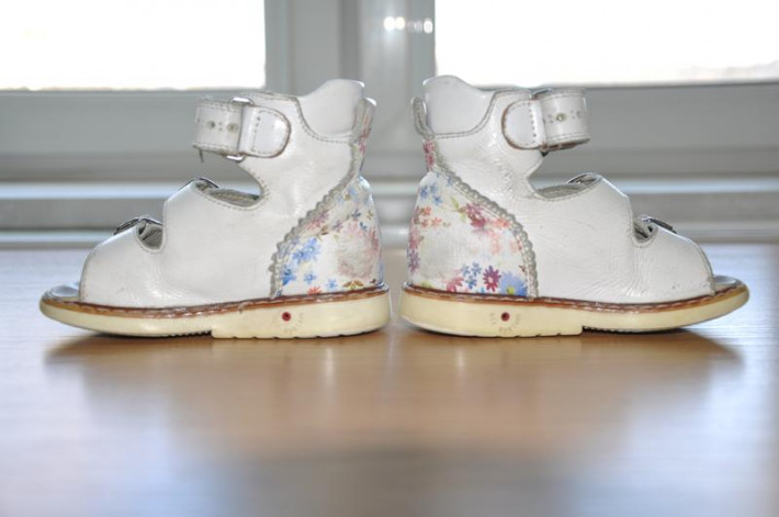 Симпатичные сандалики для девочки. Фирма ортопедическая. Модель с высоким берцем, как и рекомендуют ортопеды на первые шаги. Верхний ремешек на липучке, двое нижних ремешков перестегиваются. Белые с разноцветными цветочками. Очень нежные. Смотрятся стильно и нарядно. Подходят на любой подъем. Есть выкладка для свода стопы. В хорошем состоянии.