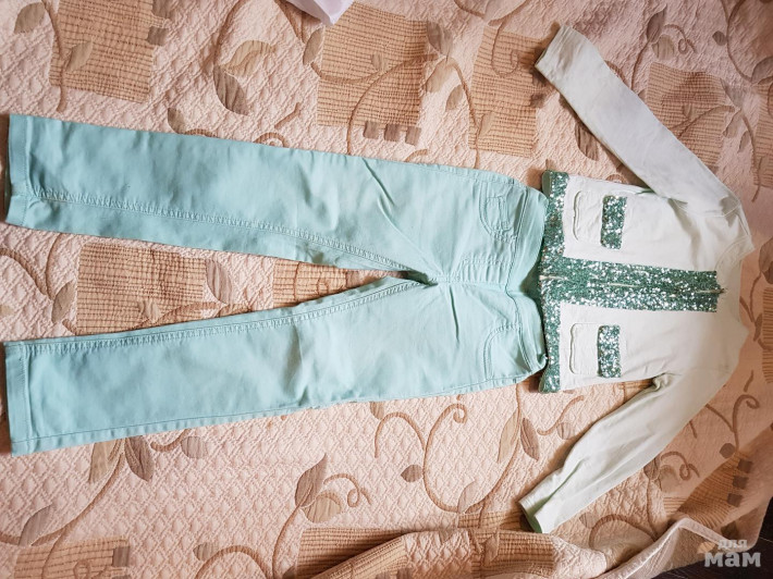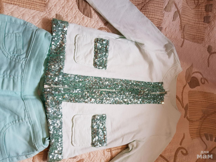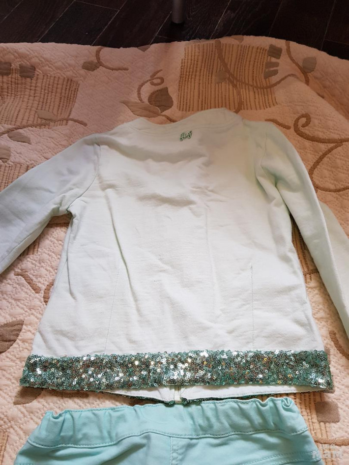 Комплект Primigi( Италия) размер 6-7лет. По этикетке - 6лет- чуть большемерит, можно до 122-125см одевать. Состояние отличное. Джинсы на резинке, кофта на молнии. Майка и кофта украшены пайетками. Цвет мятный.Ещё много красивой одежды у меня в профиле. Заходите!) Цена с почтой!