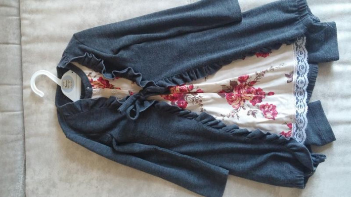 Очень красивый комплект. Лосины и туника обманка. В отличном состоянии. На рост до 108 см.