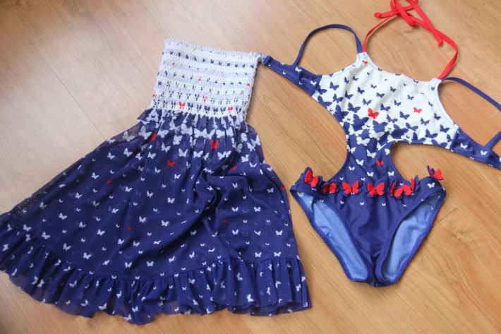 Комплект с бабочками. Трикини и юбка-сарафан из легкой сетки. Бабочки украшены стеклярусом (на попе, кстати, одна бабочка тоже есть). 1400 рублей.