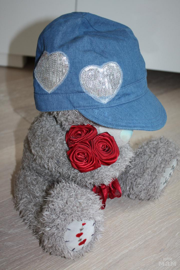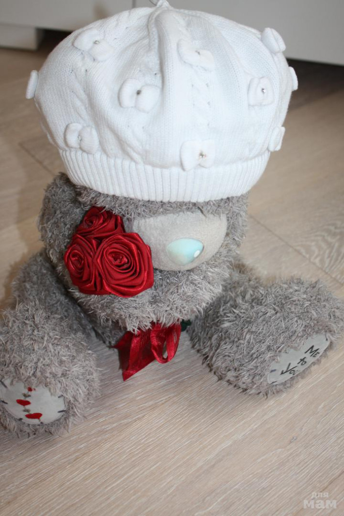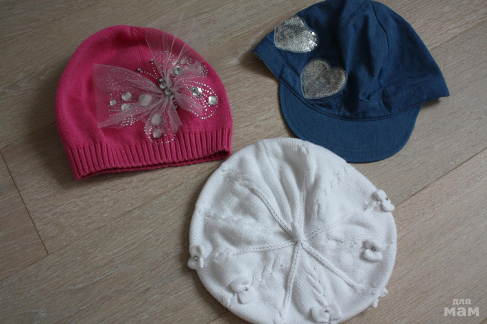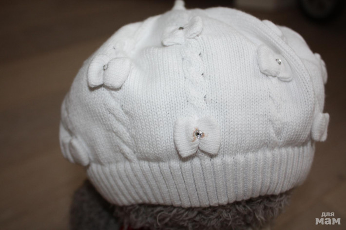 2) Белый беретик с бантиками,100% хлопок, размер не указан, скорее всего S, есть небольшой нюанс пятнышко вокруг одной стразинки на бантике (см. фото) - 400 руб.