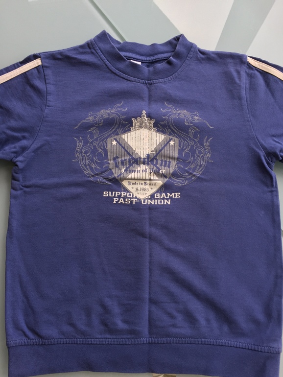 Горловина имеет классическую круглую форму ; рукав отделан белой полосой.
