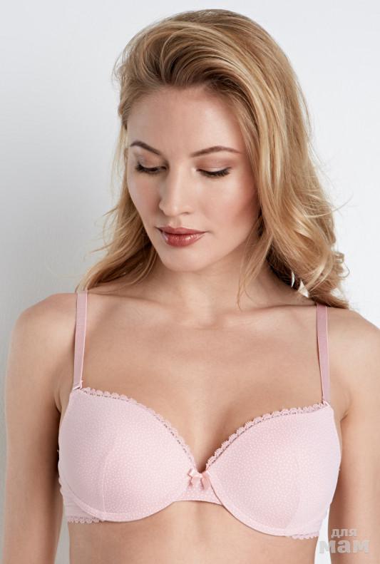 Бюстгальтер классической формы на косточках, выполнен из эластичной ткани и узкого кружева. Формованные чашки. Бретели регулируемые, съемные. Маркировка на бюсте 80 С, маломерит, чашка В.