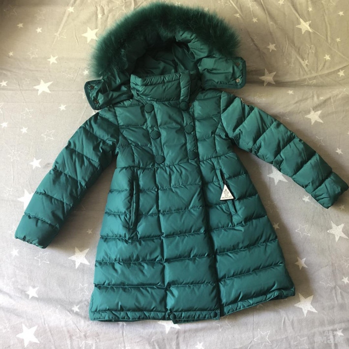 Потрясающее пальто на гагачьем пуху moncler 5/110 см на кнопках!Очень красивого цвета изумруд , б/у считаные разы, в химчистке не был и не нуждается !