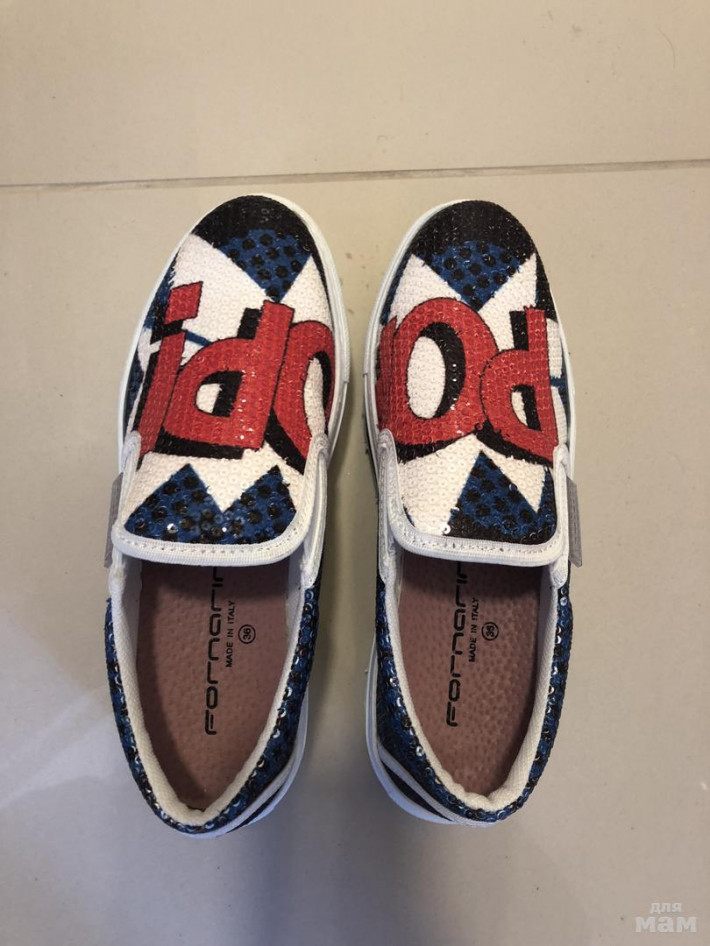 Веселые слипоны Fornarina! Размер 36! Мне впритык! На стопу 23,5 см. очень красивые все в пайетках! На лето супер!!! Коробки нет! Абсолютно новые! собиралась носить-, почему то жмут, может разношу ... цена на них 6750, я брала со скидкой -25%