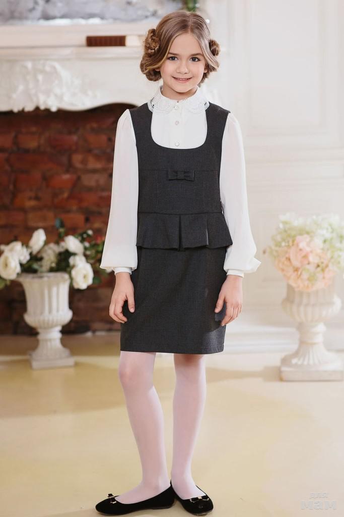 Школьное платье выполнено из костюмной ткани с декоративным бантом на линии притачивания кокетки, также платье украшает баска. На спинке изделия в среднем шве застежка на потайную молнию. Круглый вырез позволяет надевать под платье блузки с красивой отделкой из коллекции Дували.