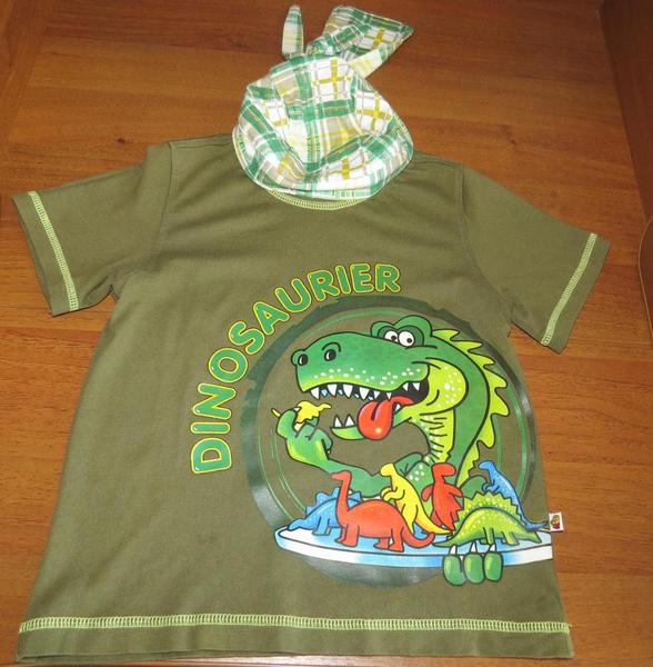 Футболка на мальчика в комплекте с банданой. Яркая, симпатичная футболка с рисунком Динозаврик, выполнена из 100% хлопка. Цвет: зеленый (болотный). К футболке прилагается оригинальная бандана в желто-зеленую клетку. Подойдет для ребенка 5-6 лет. Длина 44 см, ширина 35 см. Бандана: р. 50 (фиксируется). Состояние отличное!Встреча м. Лермонтовский проспект.