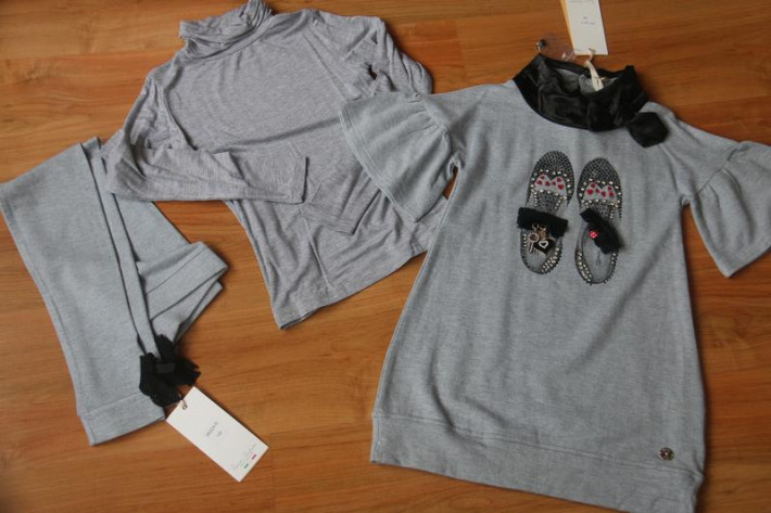 Лосинки с бантиками, тоненькая водолазка и теплая туника (внутри начесик). Очень красиво оформлен ворот.