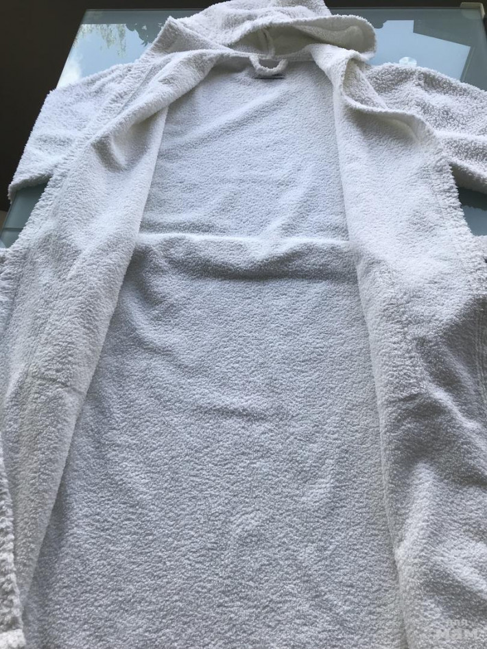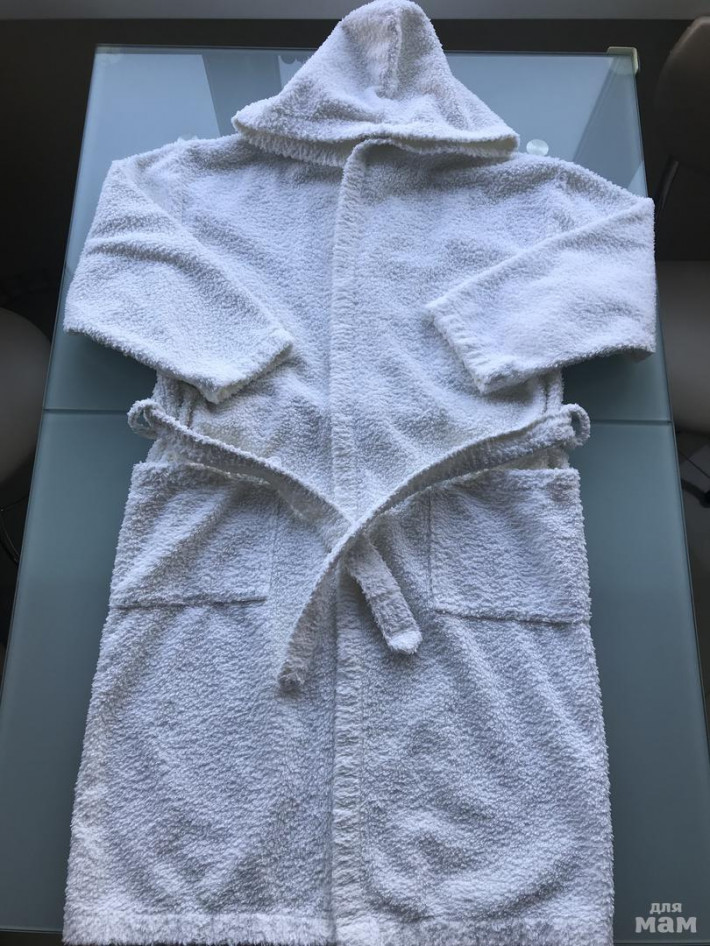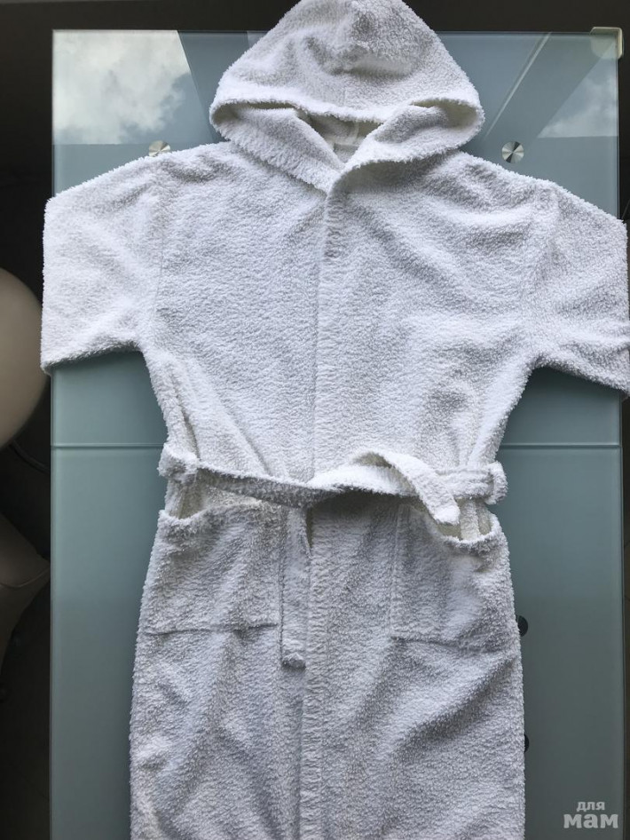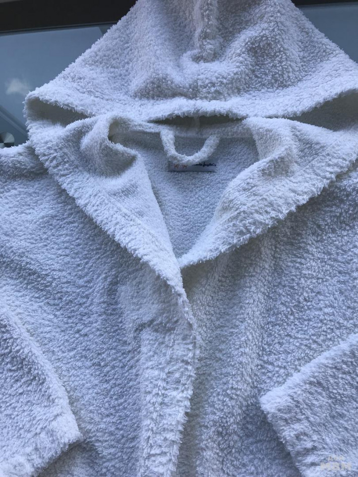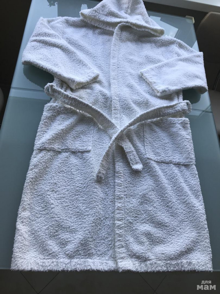 Халат махровый, с капюшоном, свободного кроя, на запах, с поясом; имеет два накладных кармана.