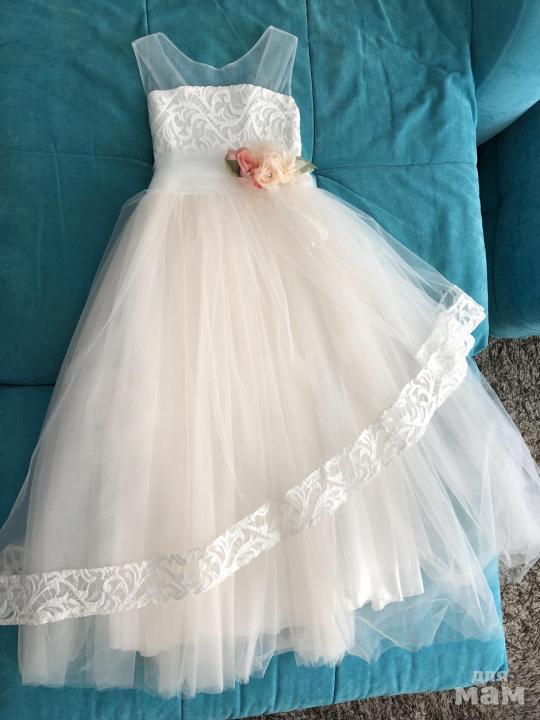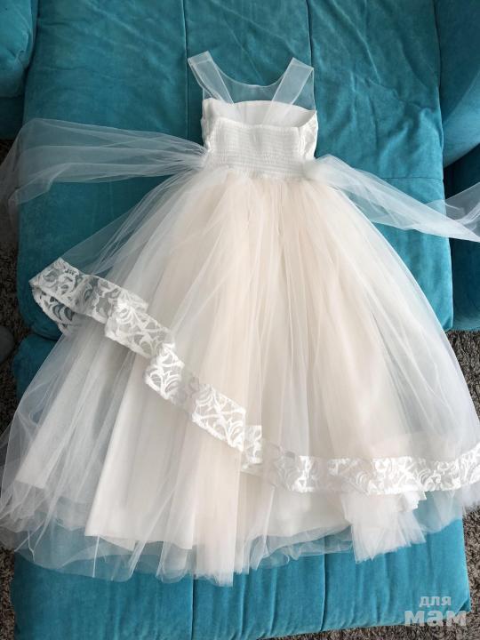 Продам платье в идеальном состоянии, одевали 1 раз.Очень красивое! Длина платья от плеча 102 см. Длина юбки 74 см. Талия на резинке. Рост 122-128. Цветок на талии на булавке, можно отстегнуть. Подклад хлопок. 2000р. пересыл 200р.