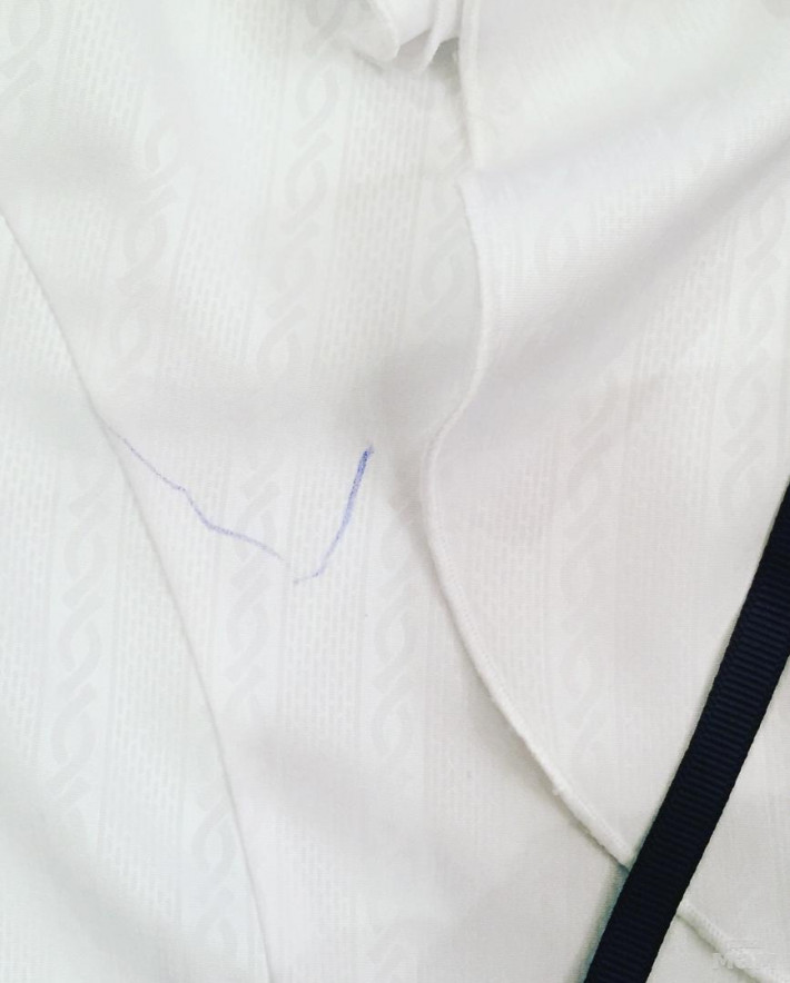Чиркнули ручкой, под жилеткой не видно было. Да и на полном фото тоже не очень видно.