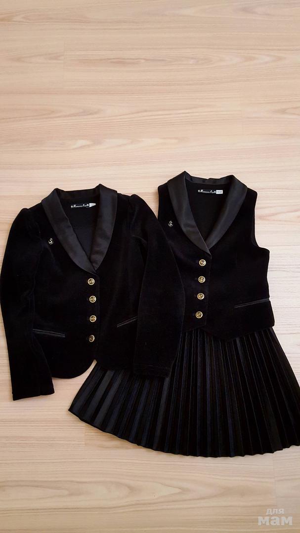 Пиджак и жилет бархат с атласной отделкой, юбка плиссе атлас, все р.134, цена за комплект 5000р.