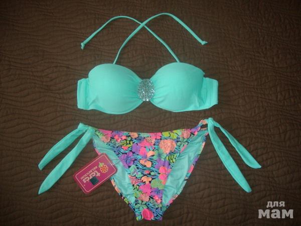 Модная, яркая расцветка. Бирюзовое бандо с красивой брошью, размер чашечки В, объем регулируется, верхние лямки отстегиваются.Плавки размер 46, но за счет сбоку завязок ,хорошо сядут и на 46-48р.