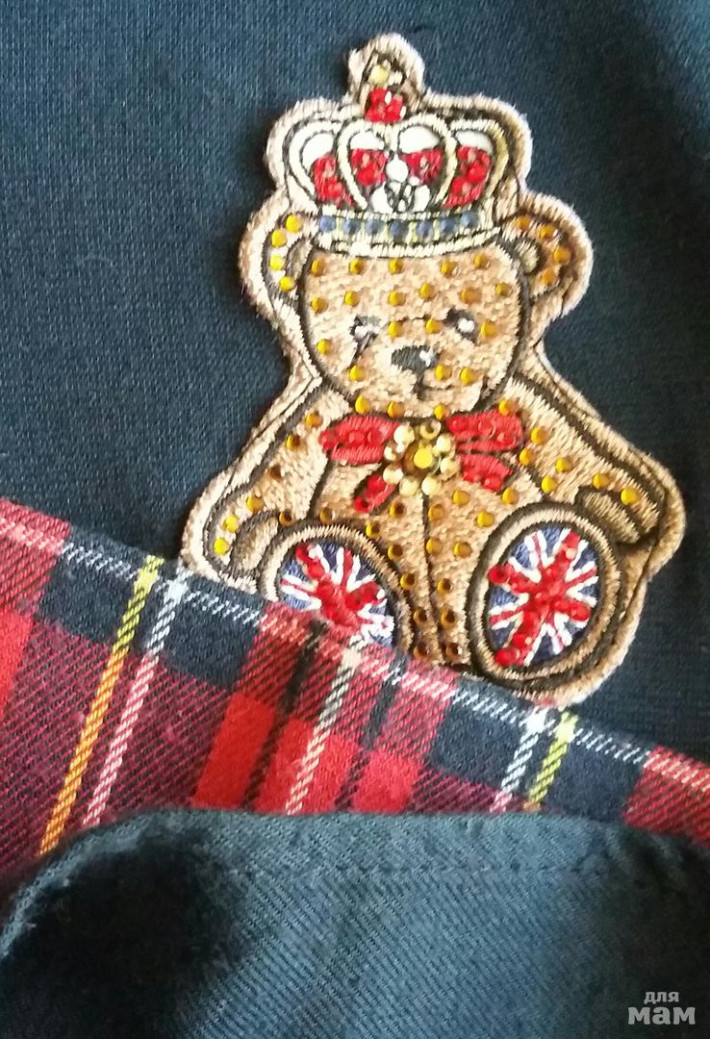 Лиф из темно-синего трикотажа, руава и ворот связаны в рубчик. На груди апликация со стразами. Юбка на х/б подкладе.