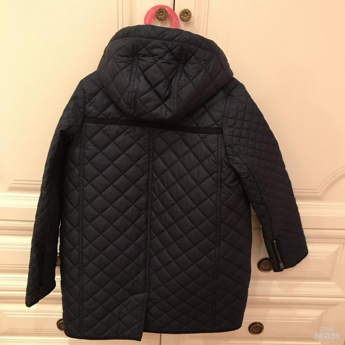 .Темно-синее стеганое пальто Burberry с отстегивающимся капюшоном. Модель с двубортной застежкой на молнию и пуговицы, двумя прорезными карманами, традиционными погонами и декоративной окантовкой на застежке, подоле и манжетах. Карманы и рукава с практичными молниями.Пальто весна-осень.Размер 10 (140 рост)Состоянии нового.Идеально для школы