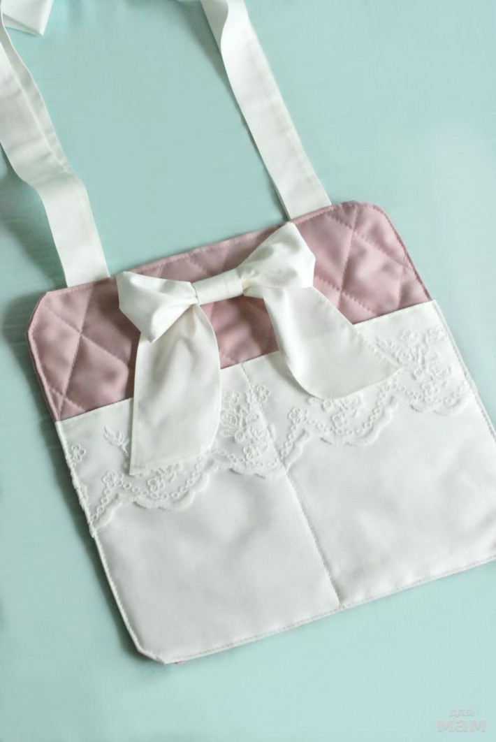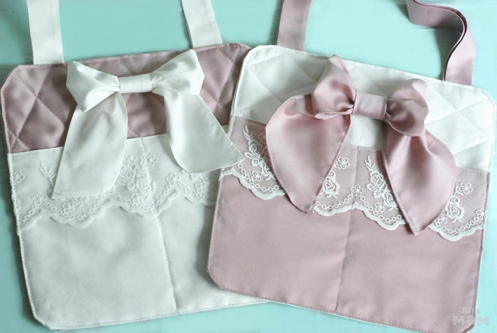 Кармашки для детской кроватки пудрового и молочного цвета размером 30*30 см станут прекрасным подарком на рождение ребенка, крестины и другие праздники. Выполнены из сатина премиум класса, декорированы нежным кружевом на сетке и бантом.