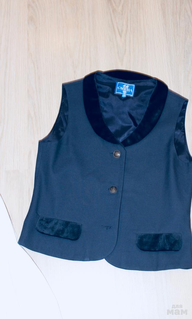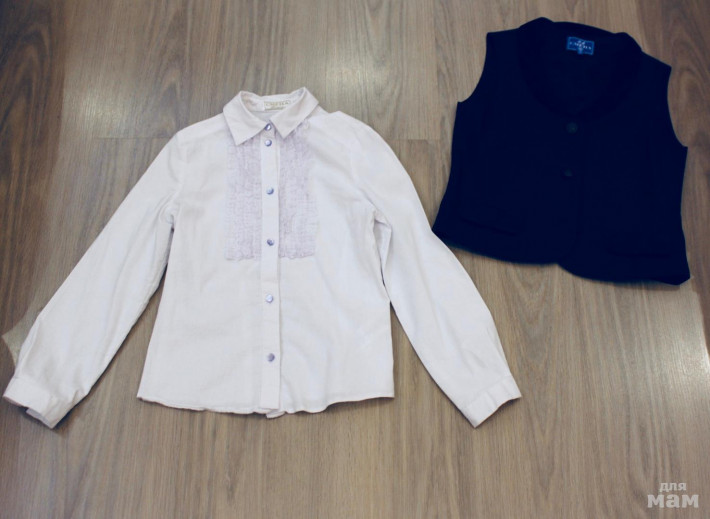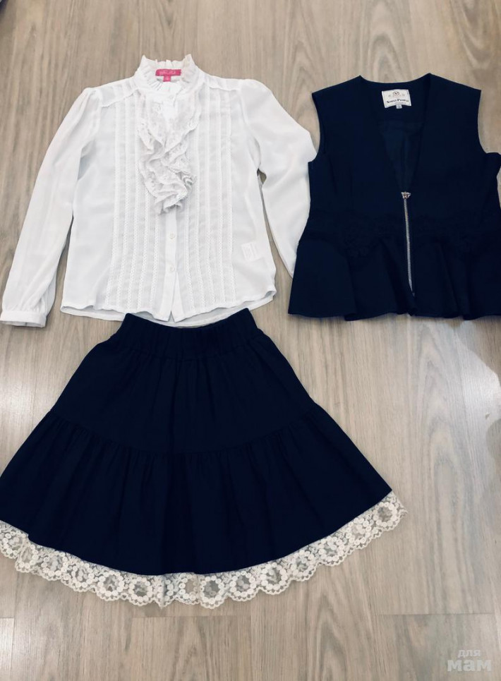 Блузка белая х/б пару раз одета, новая жилетка с бархатными вставками р.152 (подойдет от 140-146), белая юбочка с бантом (ткань типо жаккард с выбитым рисунком).