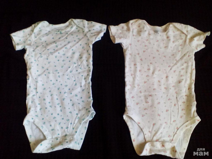 ▲▼2 шт. боди с коротким руковом американской фирмы Carters, размер 18 мес. (по мне большемерят до 2 лет). Качество трикотажа превосходное, лучше чем Mothercare в 1000 раз. Не вытягивается, не линяет, не теряет форму. Белые в зелёную и розовую розочку. Состояние отличное. 100% хлопок.