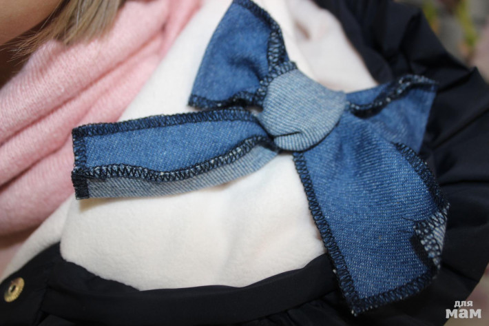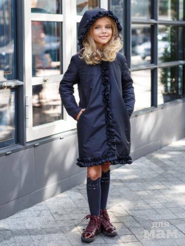 Осеннее расклешенное пальто с нежным рюшем. Выполнено из водоотталкивающей плащевой ткани. Внутри тонкий и теплый наполнитель - Slimtex, плотностью 250 гр, рассчитана та температуру от 15 до -10 градусов. Подклад - флис, застежка - кнопки. Цвет темно синий, на спинке съемный бантик из темного денима. Верхняя ткань хорошая плотная, внутри мягенький флисик, бантик это брошь ( пристегивается по желанию). Пальто размер 140, но маломерит подойдет на рост 128 .