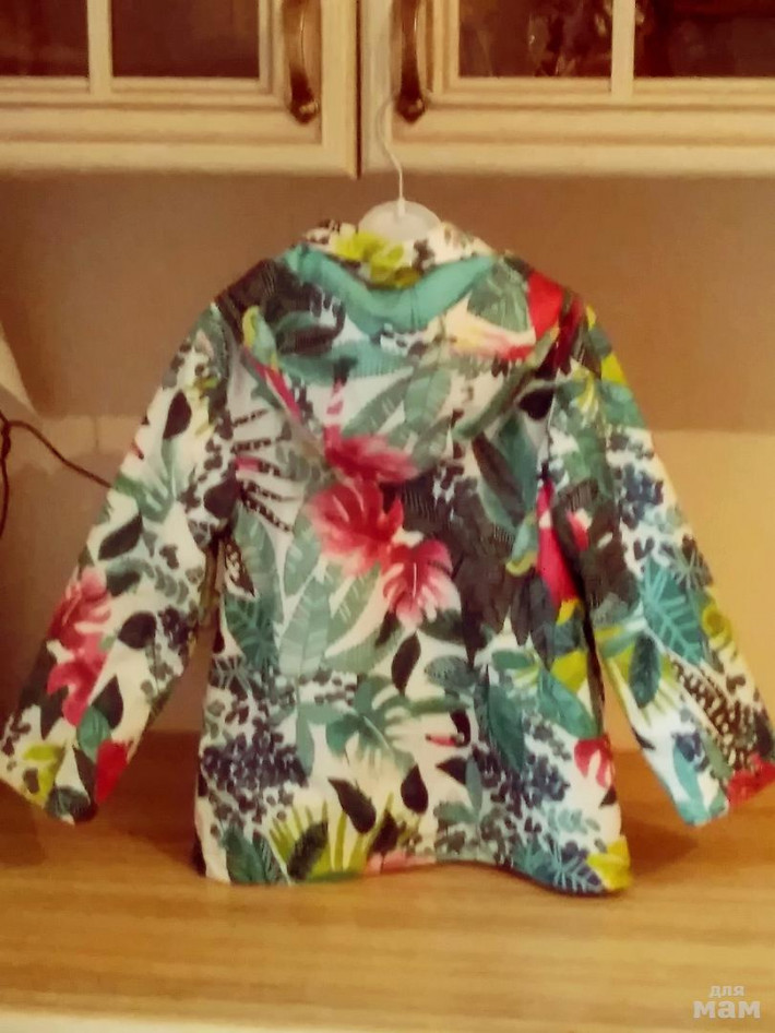 Плащик для девочки, яркий и очень красивый. Верх с непромокаемая покрытием (полиуретан). На подкладке. Капюшон не отстегивается. Застежка - молния и пуговицы. Рукав - 41см. Ширина 36см. Длина по спинке от плеча - 49. Носили мало. Состояние отличное.