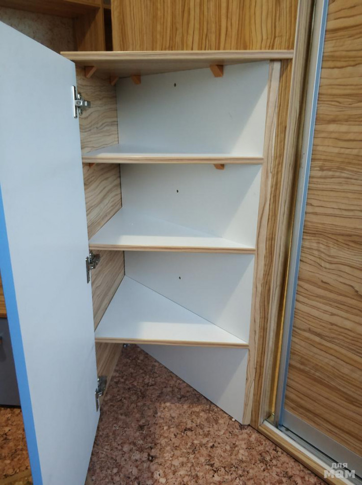 В комплекте бонусом навесной мини-шкафчик. В нем 4 отделения, дверца-вертушка. 80*80*23 см.