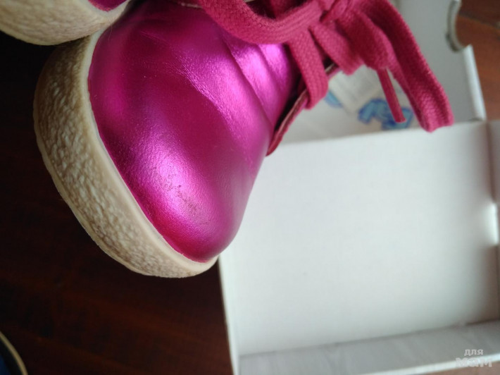 Мягкие ботиночки, натуральная кожа. Стелька 12,5 см примерно. Скорее чуть больше. Обували на первые шаги, несколько раз всего (до 5),но успели ободрать мысы - немного слезла краска, видно только под определённым углом. В остальном состояние отличное.