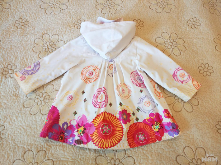 Ооочень красивый плащик на хлопковой подкладочке. Catimini. Размер 2, но за счёт своего кроя "колокольчиком" большемерит!!! При росте 86 длинноват и рукава с манжетиком можно делать. Далее рукава откатать и длина будет до колена и чуть выше. Капюшончик отстёгивается. Застёгивается плащик на молнию и пуговки.