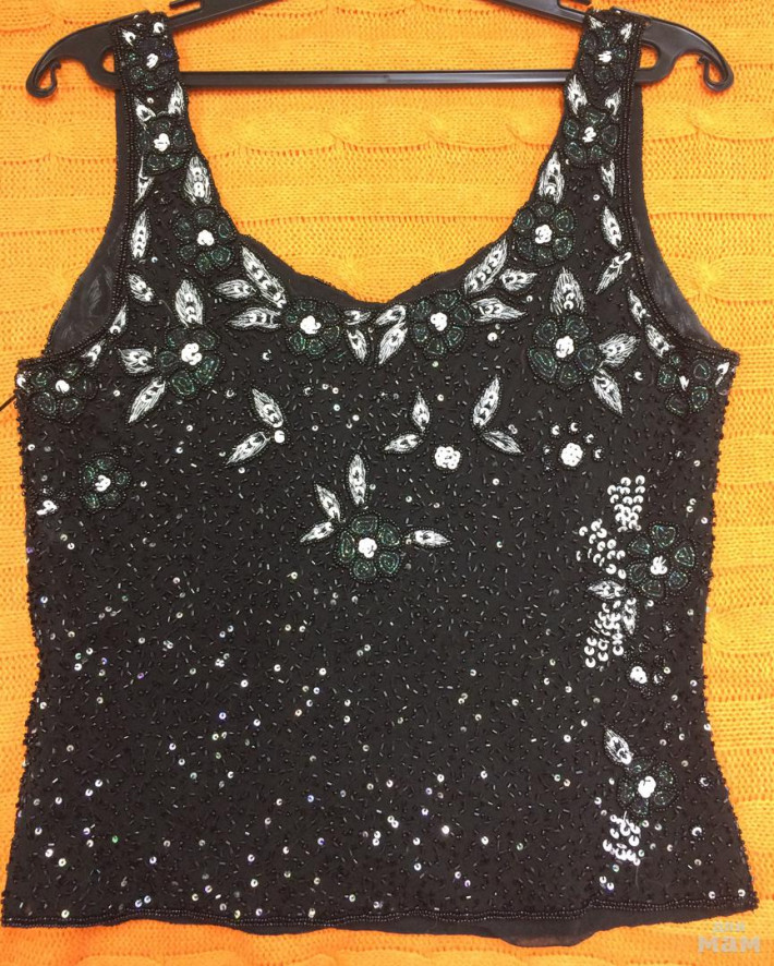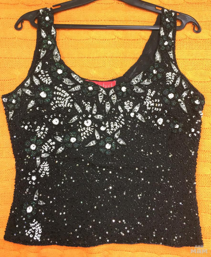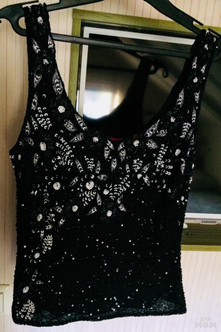 Шикарный топ из 100% шелка, расшит бисером и пайетками, вышивка выполнена очень качественно. На подкладке из шифона. Состояние нового, надела один раз на корпоратив. Размер S, на наш 42-44.