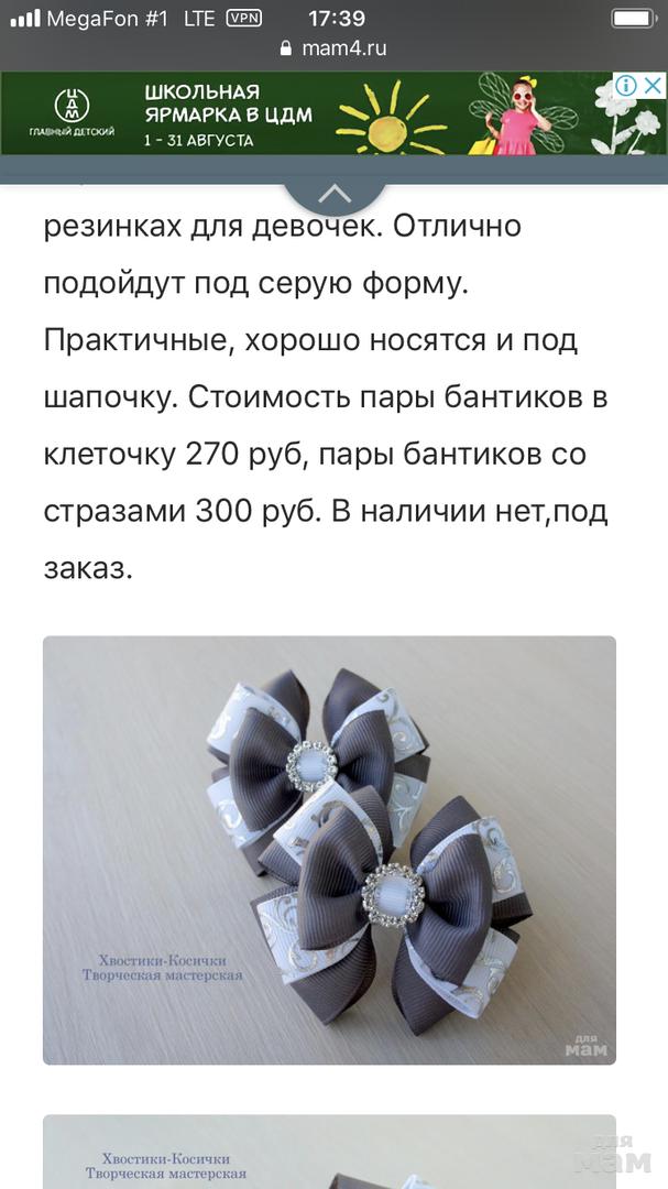 Предлагаю вашему вниманию две пары новых школьных бантиков на резинках для девочек. Отлично подойдут под серую форму. Практичные, хорошо носятся и под шапочку. Стоимость пары бантиков в клеточку 270 руб, пары бантиков со стразами 300 руб. В наличии нет,под заказ.