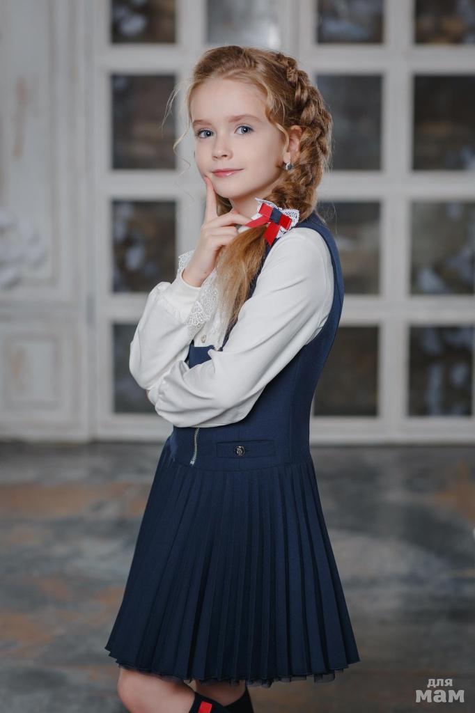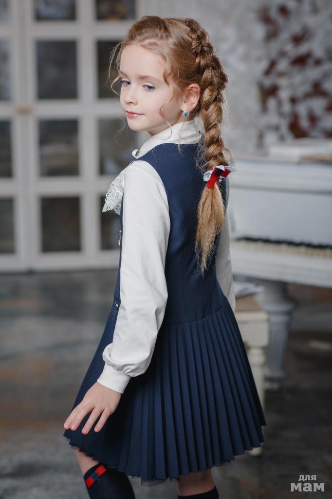 Сарафан на подкладке приталенного силуэта с чуть заниженной линией талии из классической костюмной ткани для девочки школьного возраста с гофрированной юбкой, обеспечивающей свободу движений. Красивый силуэт модели поддерживается пышной оборкой из сетки, настроченной по низу подкладки. Лиф с классическими линиями рельефов по переду и спинке застегивается на металлическую молнию с декоративной золотистой подвеской. Удобные карманы застегиваются на пуговки. Свойства ткани соответствуют всем санитарно-гигиеническим требованиям, предъявляемым к детской одежде.