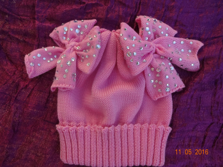 Очень красивая и качественная шапка от Карины. Сезон весна-осень.Стразы Сваровски. Состояние новой,надели один раз.На 55см уже совсем впритык((