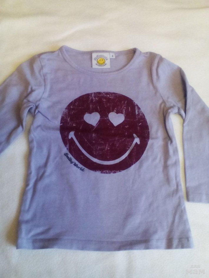 Лонгслив футболка 3-4 г. Немецкой фирмы Smiley World Association. Супер указан 4, но лучше носить с роста 98 см. Нетривиальный дизайн. Украшена принтом в виде забавного смайлика. Трикотаж супер 100% хлопок. Цвет сиреневый. Состояние отличное, немного маломерит, в связи с чем носили около месяца. В наличии 2 штуки. Цена за единицу. Почте да. Покупала за 1100 р. за штуку.