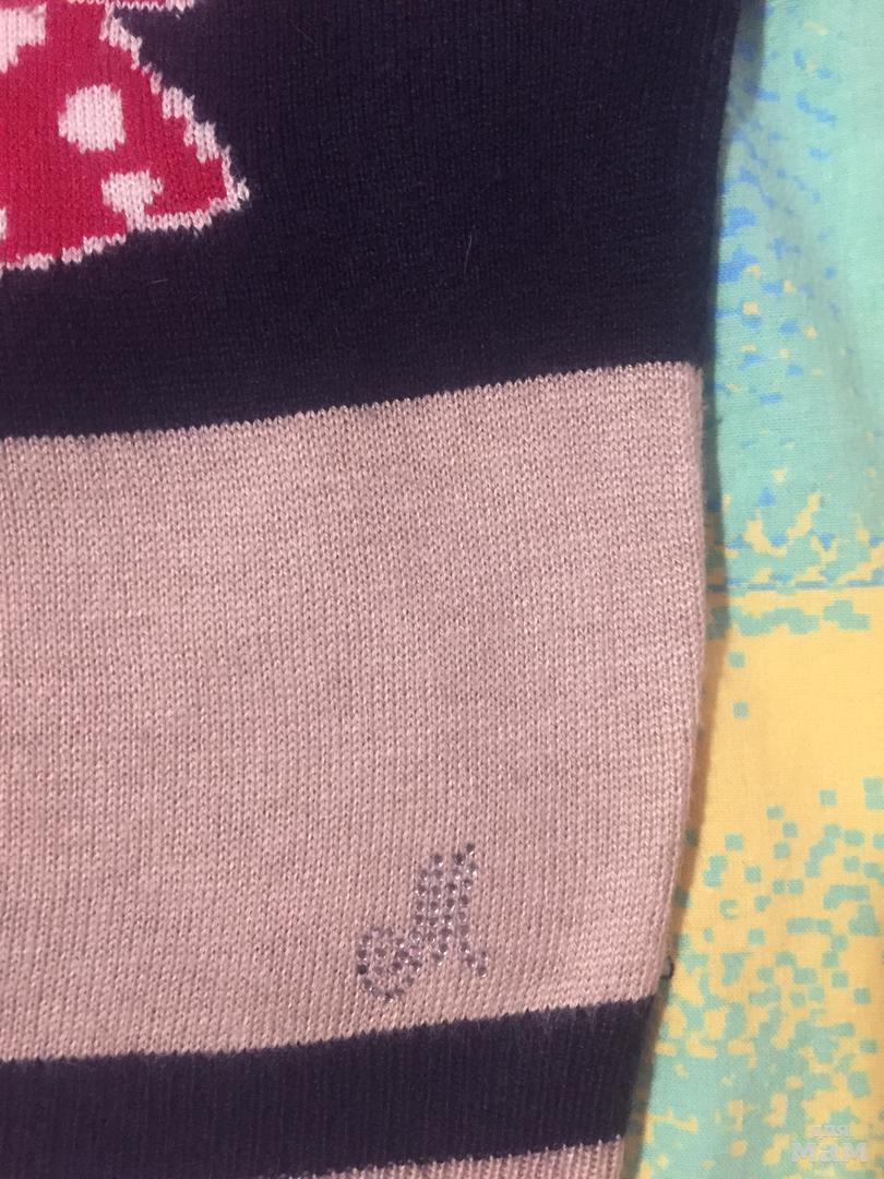 Привет! На втором фото под бантом через бежевую пряжу как будто синева проступает, не знаю что это, в носке незаметно совсем, в общем состояние очень хорошее, без катышек, не заношенное совсем. На первом фото под другим углом вообще не вижу