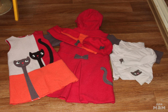 Очень красивый и необычный комплект Кошки. Привлекает внимание. Теплющий 100% шерсть. Пальто(100% шерсть,хлопковый подклад), сарафан (шерсть, хлопковый подклад), водолазка (хлопок) + аксы перчатки, шарфик и шапочка. Все из одной коллекции. На возраст 4-5,5 лет.