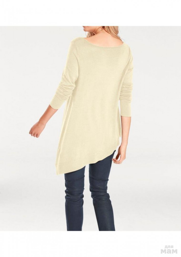 Мягкий трикотаж с высоким содержанием вискозы обеспечит Вам оптимальный комфорт на весь день. Асимметричная линия нижнего края разбавляет нарочитую лаконичность фасона с классическим круглым вырезом и длинными рукавами нотками динамичности. Джинсы, чиносы, "дудочки", узкая юбка - решайте сами, с чем носить этот пуловер! Длина ок. 70 см. Состав: 80% виск, 20% полиамид. Цвет: экрю.