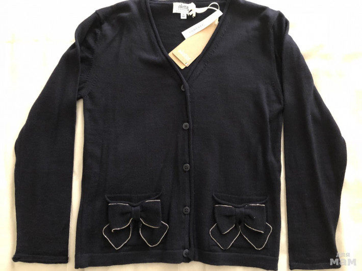 Кофта темно-синено цвета, на карманах бантики отделаны золотой тесьмой р.146, цена 3800₽