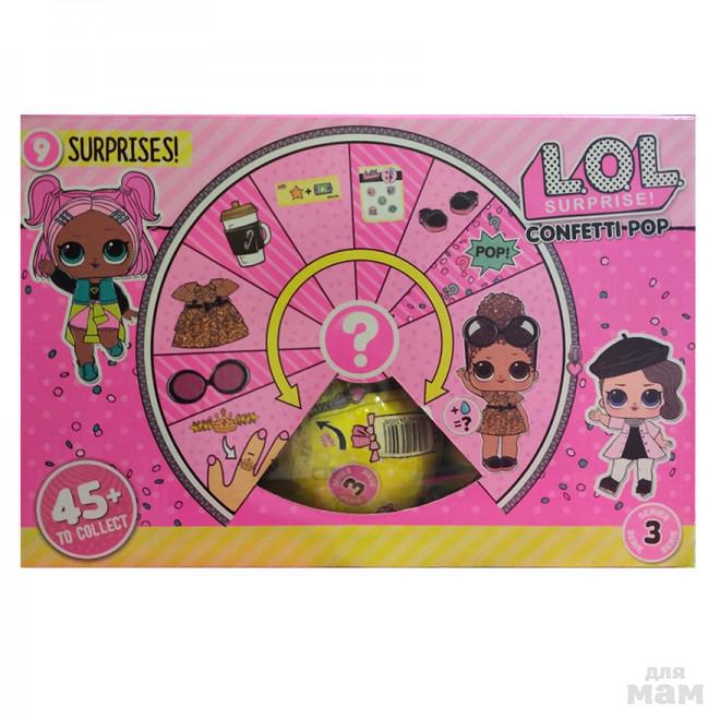 Новинка 2018 года Lol Confetti Pop - 3 серия известных кукол. Открыв обертку, Вы увидите донышко с нарисованными стрелками. Поверните по или против часовой стрелки до секции где спрятана ленточка. Потяните за ленточку и произойдет выброс конфетти и верхняя секция шарика подпрыгнет вверх и Вы уведите содержимое шарика.