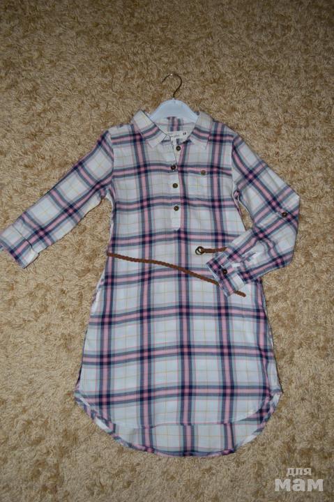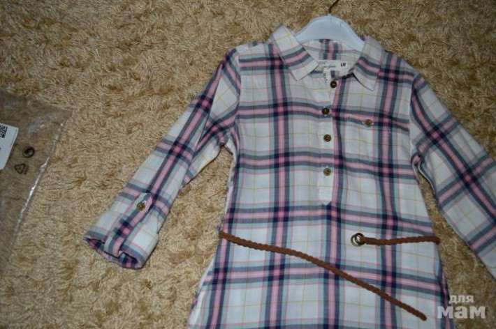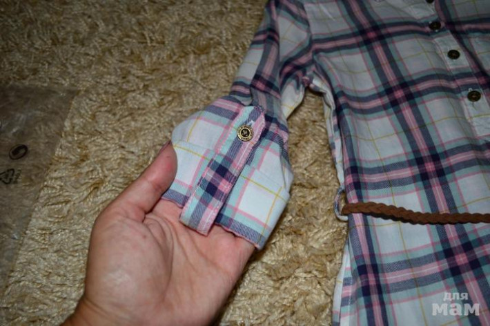 Платье из хлопковой ткани с поясом из искусственной замши. На платье воротник и застежка на пуговицы сверху. Нагрудный карман на пуговице и боковые карманы. Длинные рукава с застежкой на пуговицы снизу, а также хлястиками на пуговице. Скругленный нижний край, спинка немного удлинена. Без подкладки.