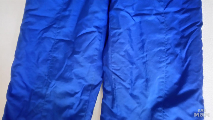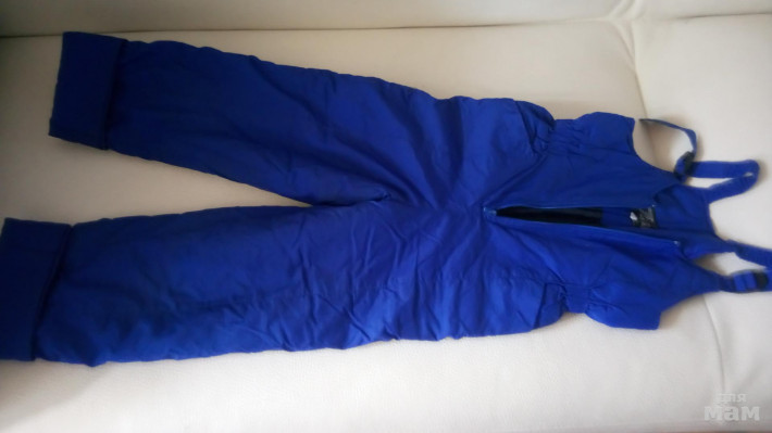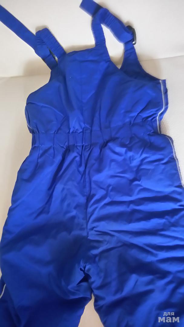 Ярко-синий, непромокаемый полукомбинезон на худую высокую девочку на утеплителе. по талии - резинка. внизу брюк еще подвороты на 3-7см маркировка - 128