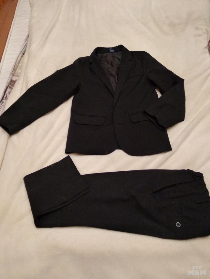 Комплект черного цвета для худого мальчика 5-7 лет, маркировка 128. Пиджак не плотный-формованный, а легкий. 500руб Брюки узкие, с утяжкой по талии, ширина талии максимум 60см.200руб Ткань хлопок полиэстер, мягкая, удобная, можно стирать в машинке - очень практично.на брюках коленки блестят.